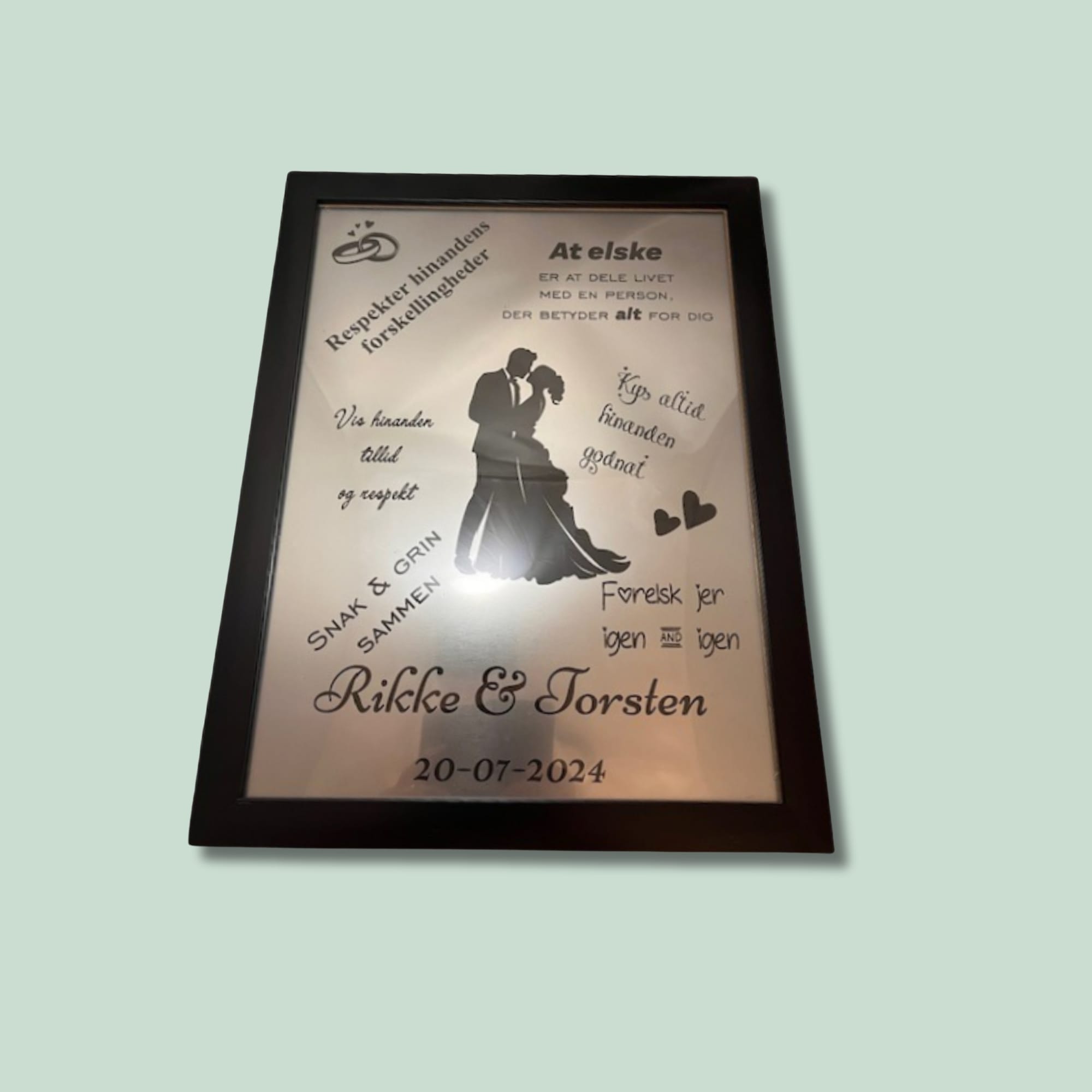 Personlig gør gaven med navne og dato på dagen æresgæster, uanset om det er til bryllup, kobber -, sølv -, guld -, diamant eller krondiamant bryllup.