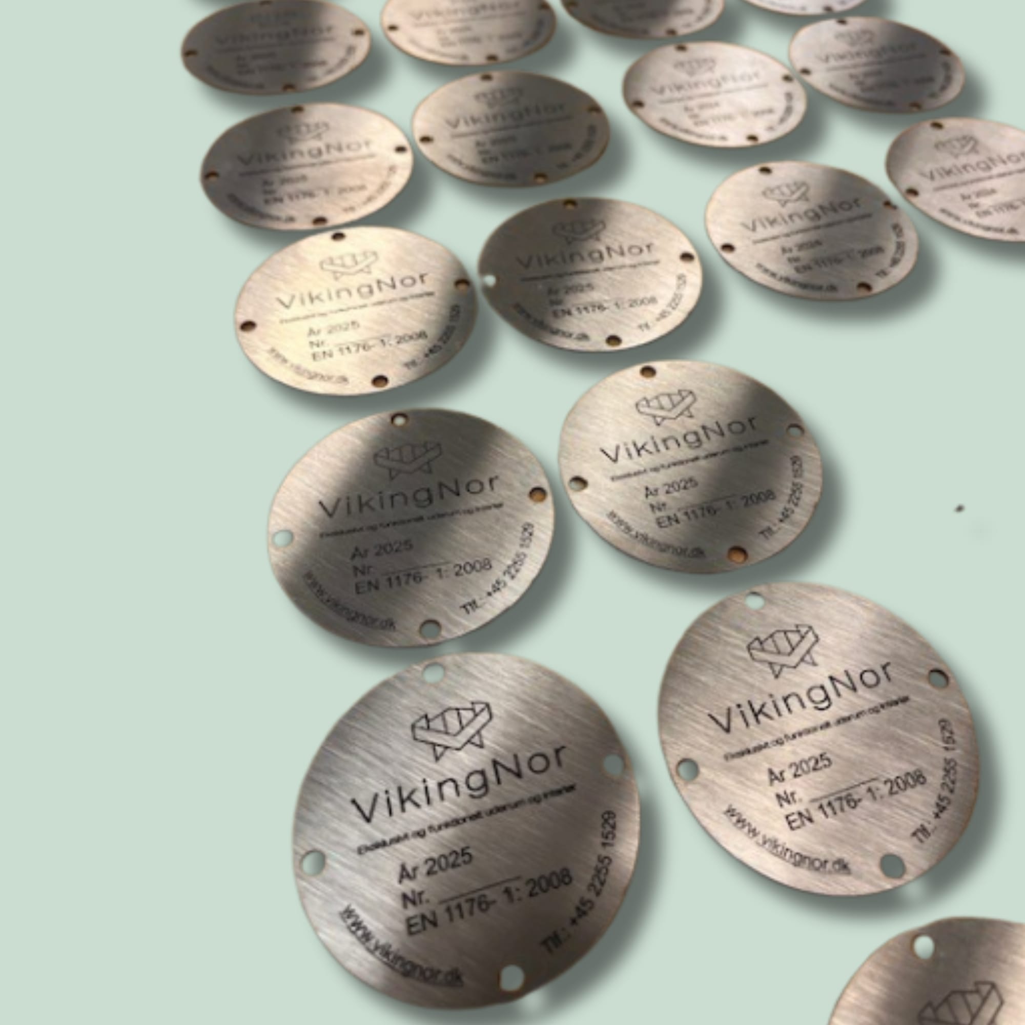 Disse skilte sidder på kundens produkter, og lavet i børstet stål. Der er mulighed for at få skilte tilpasset til dine behov.