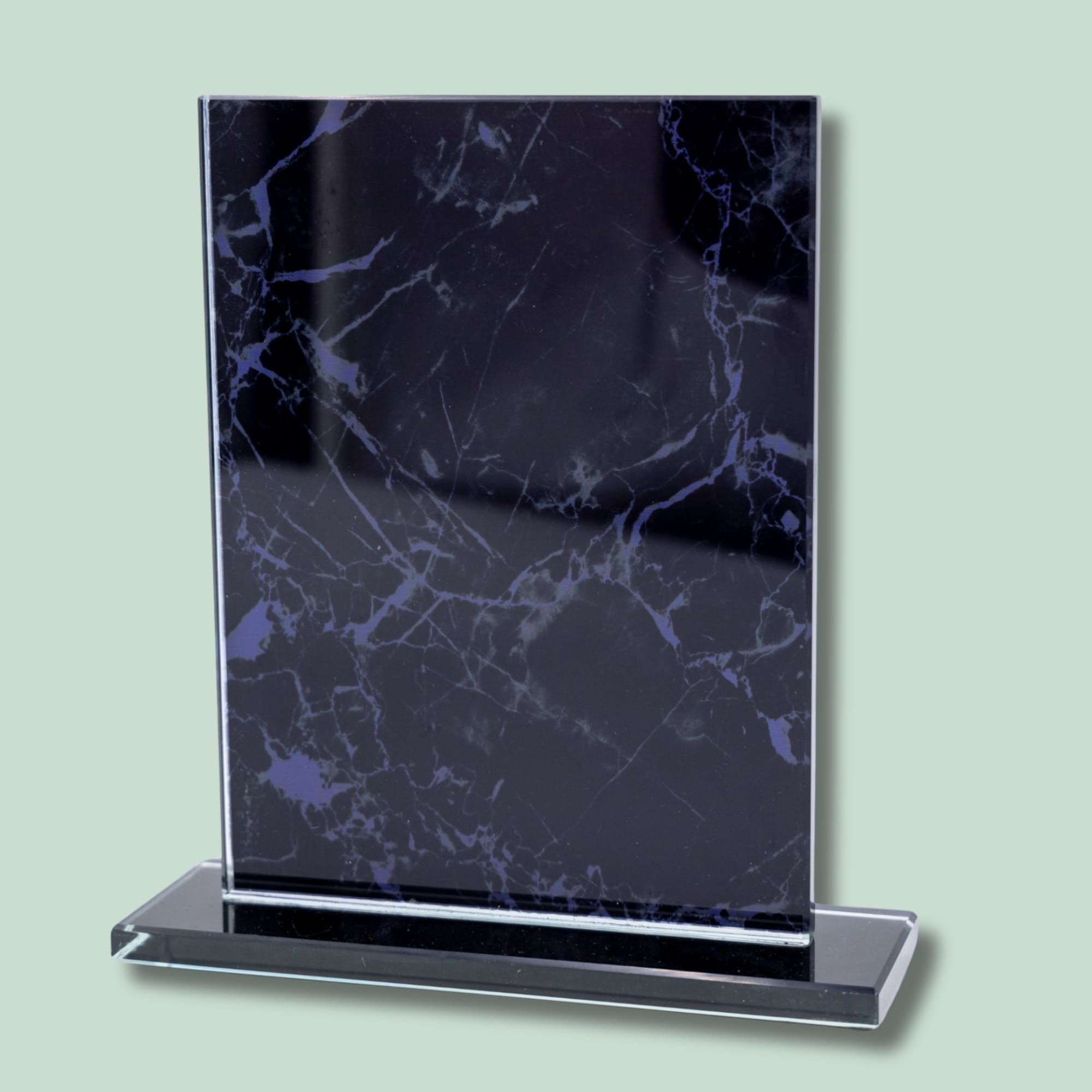 Statuetten har sort baggrund, som bliver graveret væk, så skriften fremstår som glas