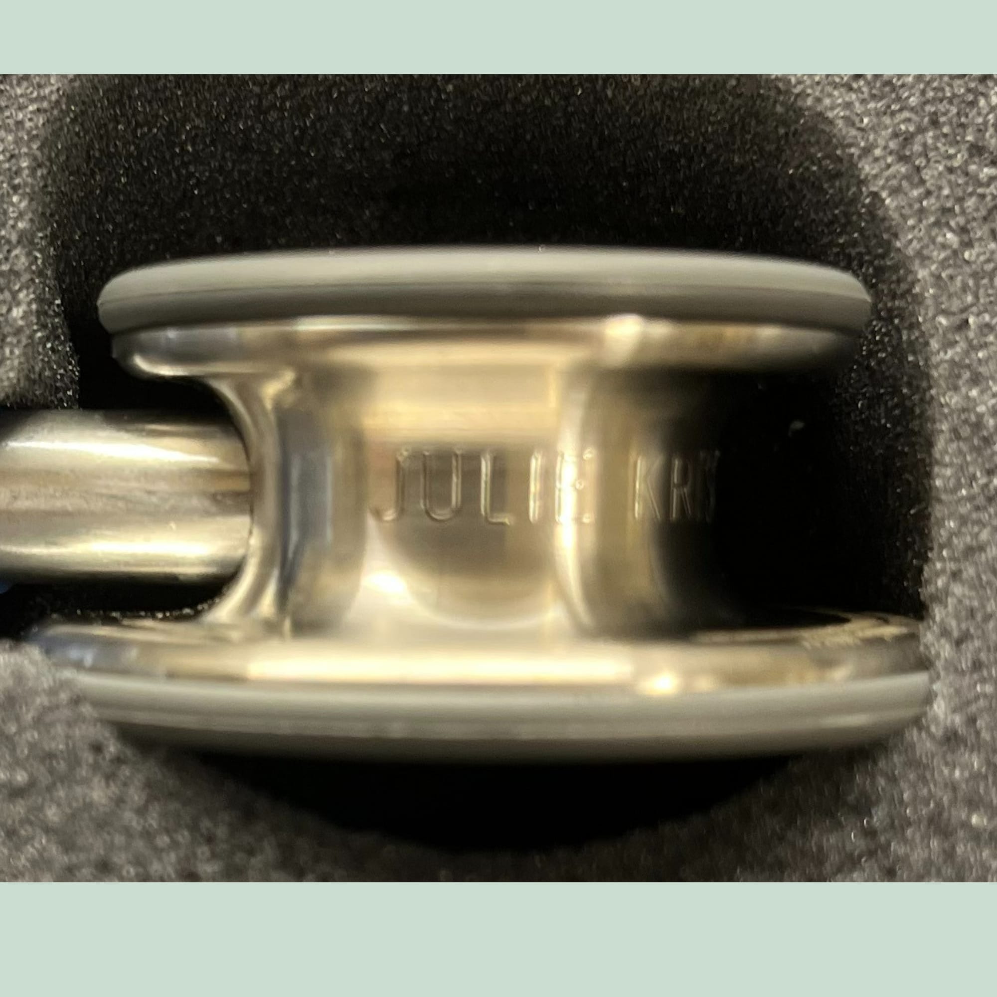 Vi kan dybdegravere på dit stetoskob. Der er mulighed for at få graveret på stangen der går op i øret eller i bunden af pladen.