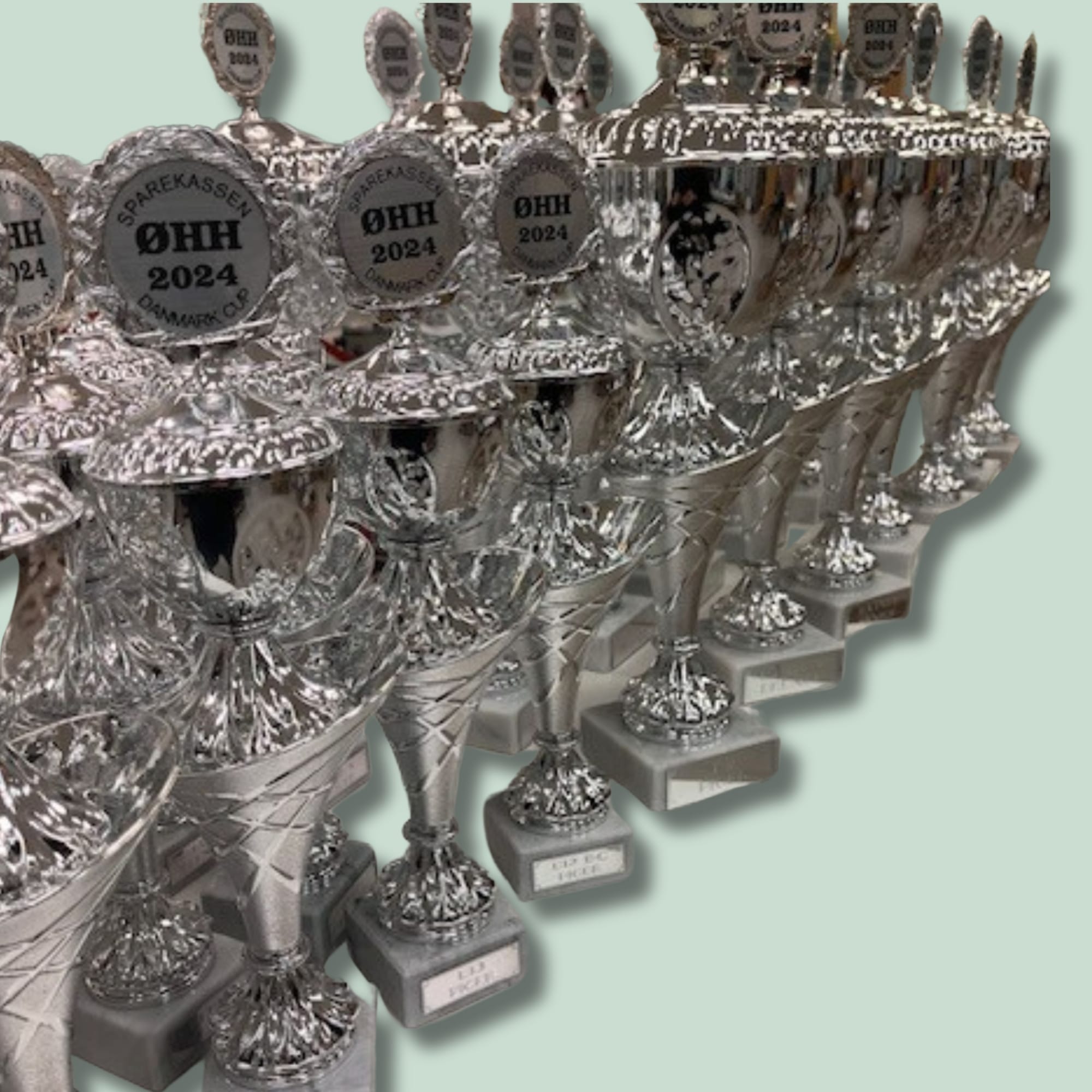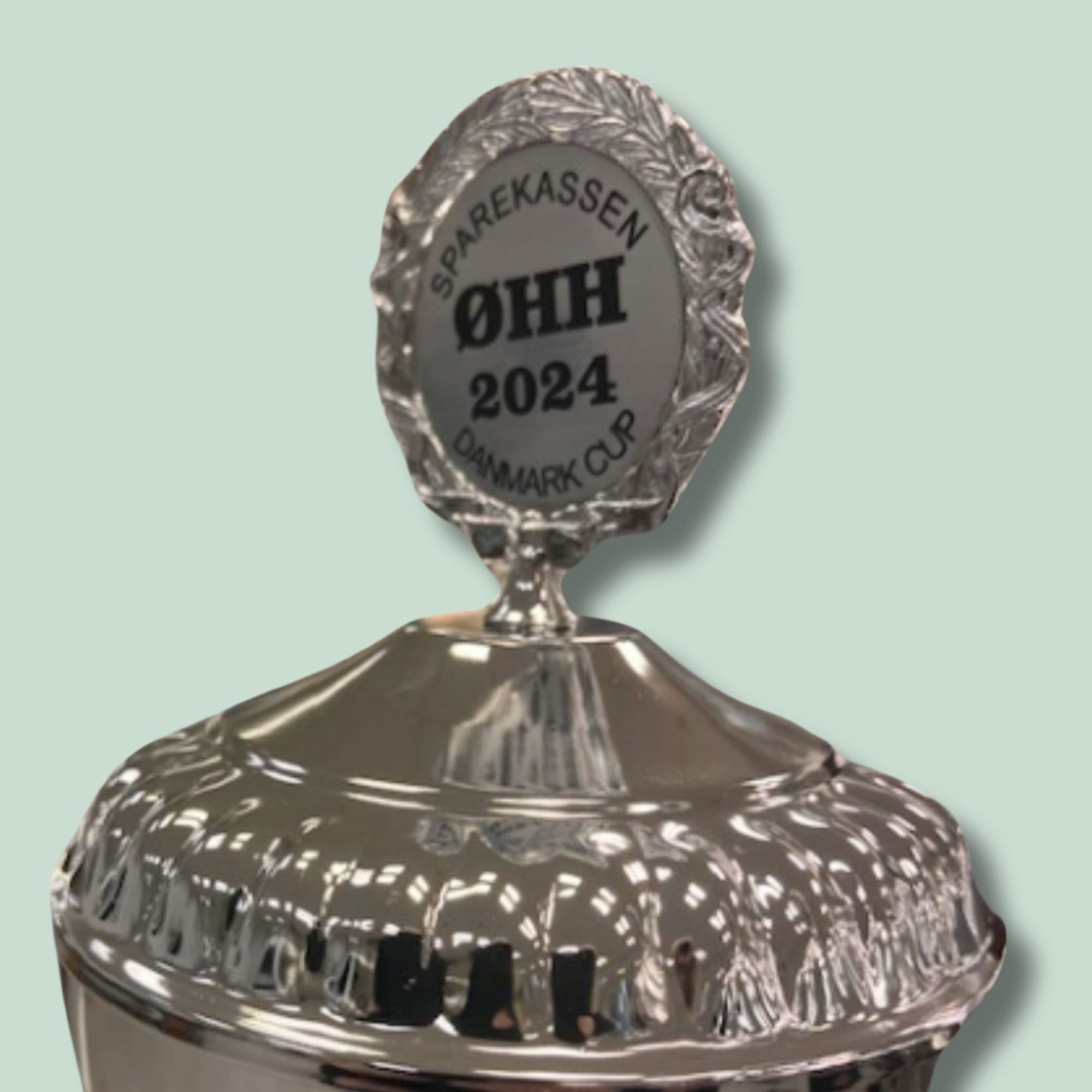 Den afsluttes med et låg og toppen er formet som en laurbærkrans. Der er mulighed for at sætte et klistermærke på, der passer til dit arrangement – ​​din forenings- eller stævnes navn.