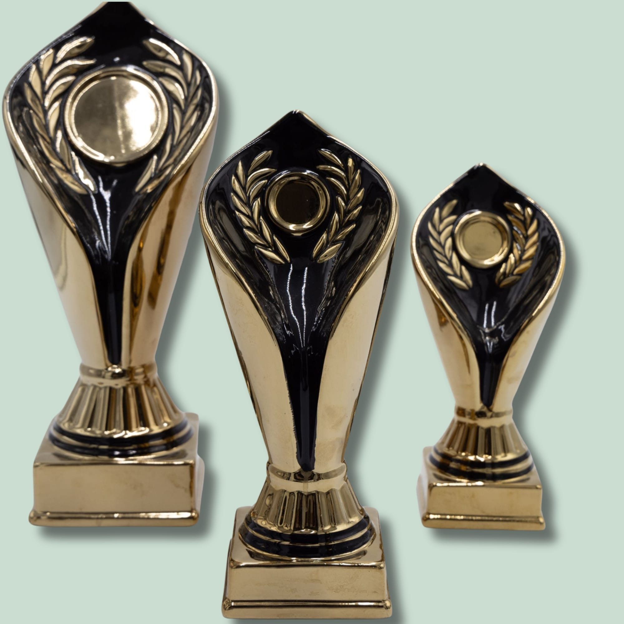 Tre sorte og guld trofæer i forskellige størrelser.
