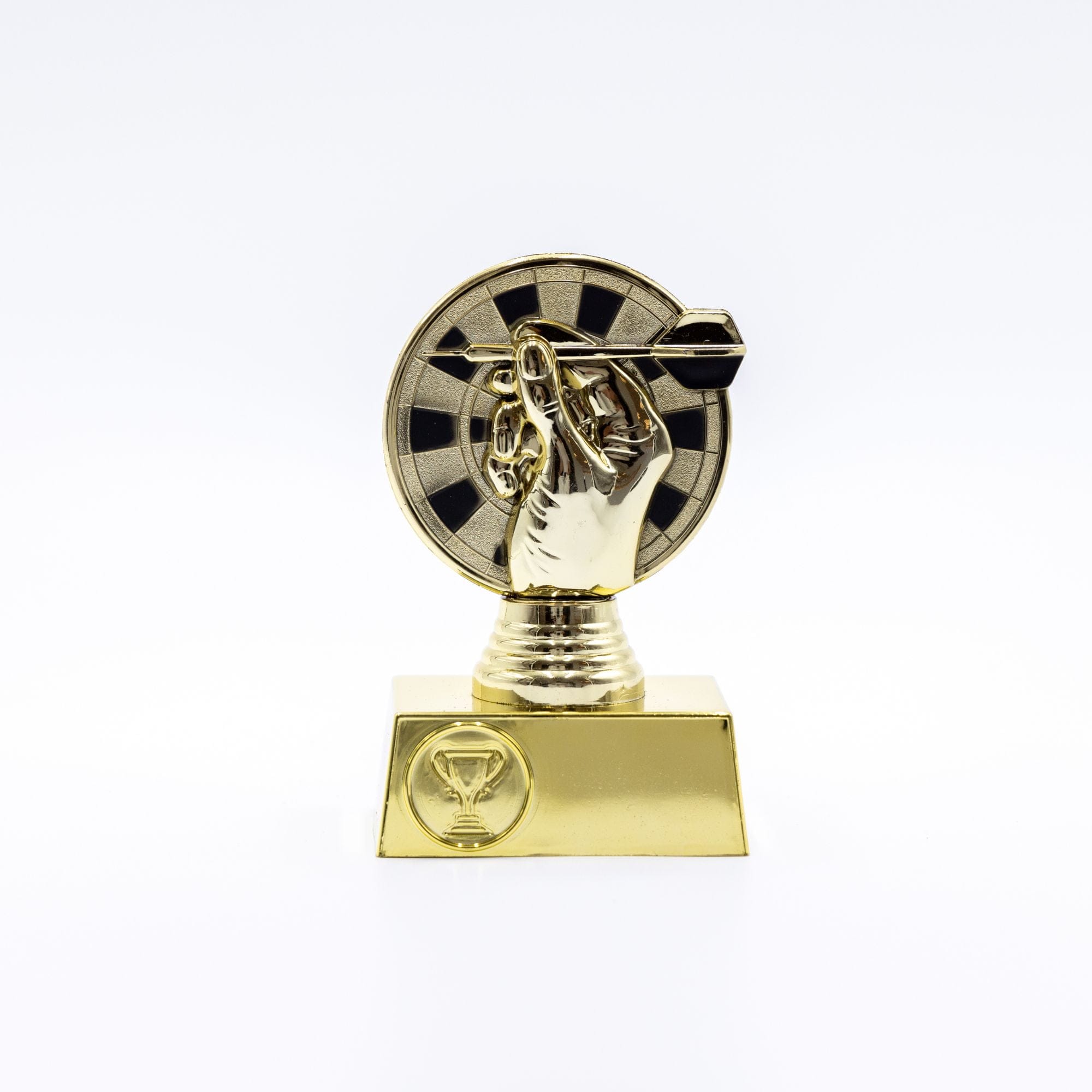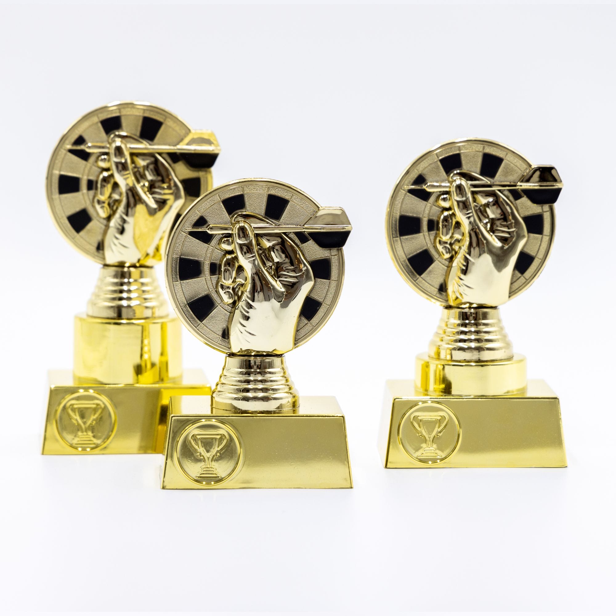Flot dartstatuette i 3 størrelser. Alt i guld med sort på dartskiven